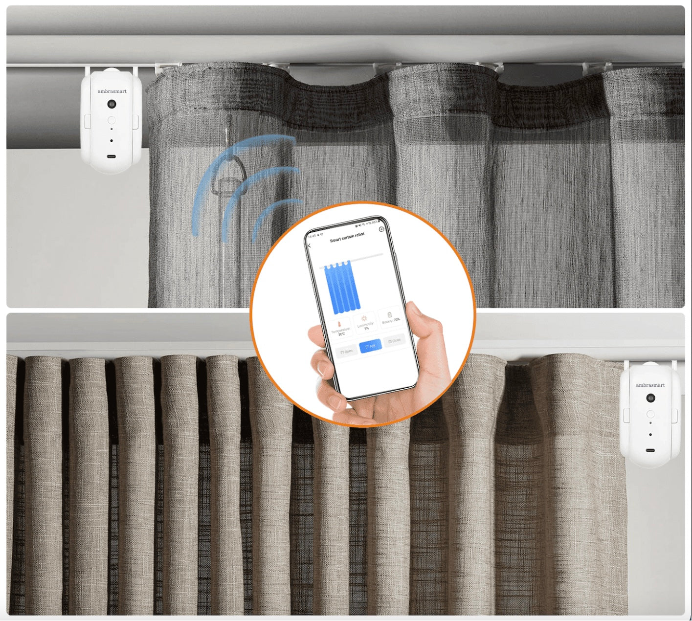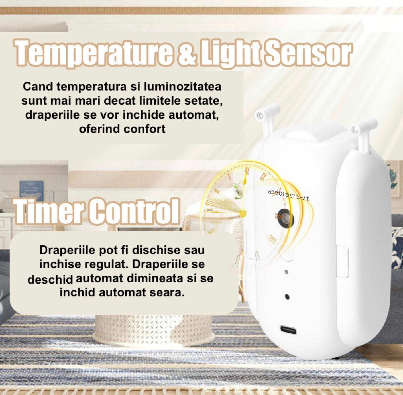 Optează pentru o locuință inteligentă și modernă cu Robotul de Automatizare Wireless pentru Draperii ambrasmart – soluția ideală pentru un control simplu și elegant al draperiilor, cu funcții avansate de conectivitate și confort.